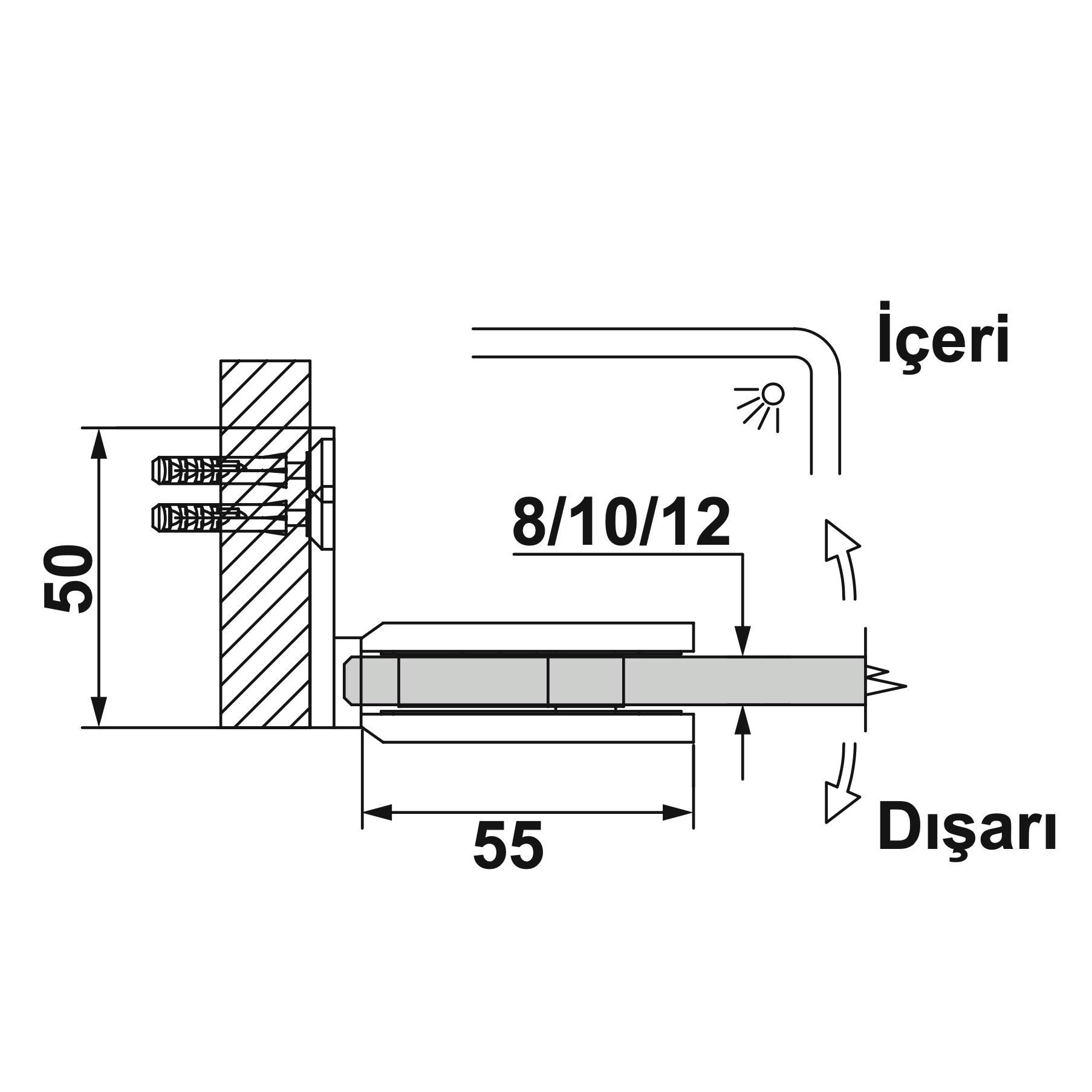 Cam kalınlığı: 8 - 10 - 12 mm. Malzeme: Pirinç. Donanım: Her iki yönde en fazla 25° açık konumdayken otomatik kapanma. Montaj: Duvardan cama