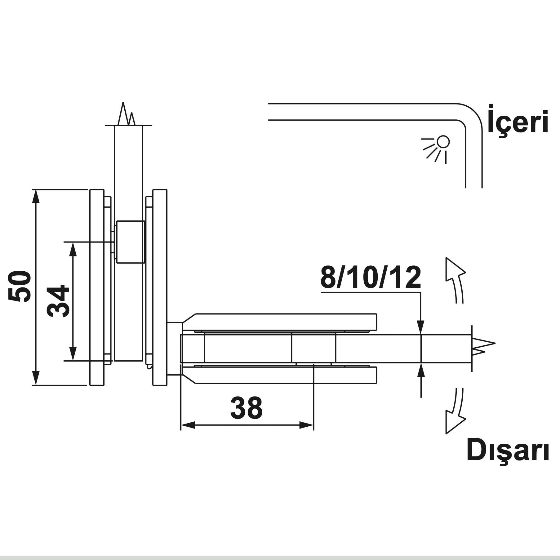 Cam kalınlığı: 8 - 10 - 12 mm. Malzeme: Pirinç. Donanım: Her iki yönde en fazla 25° açık konumdayken otomatik kapanma. Montaj: Camdan cama