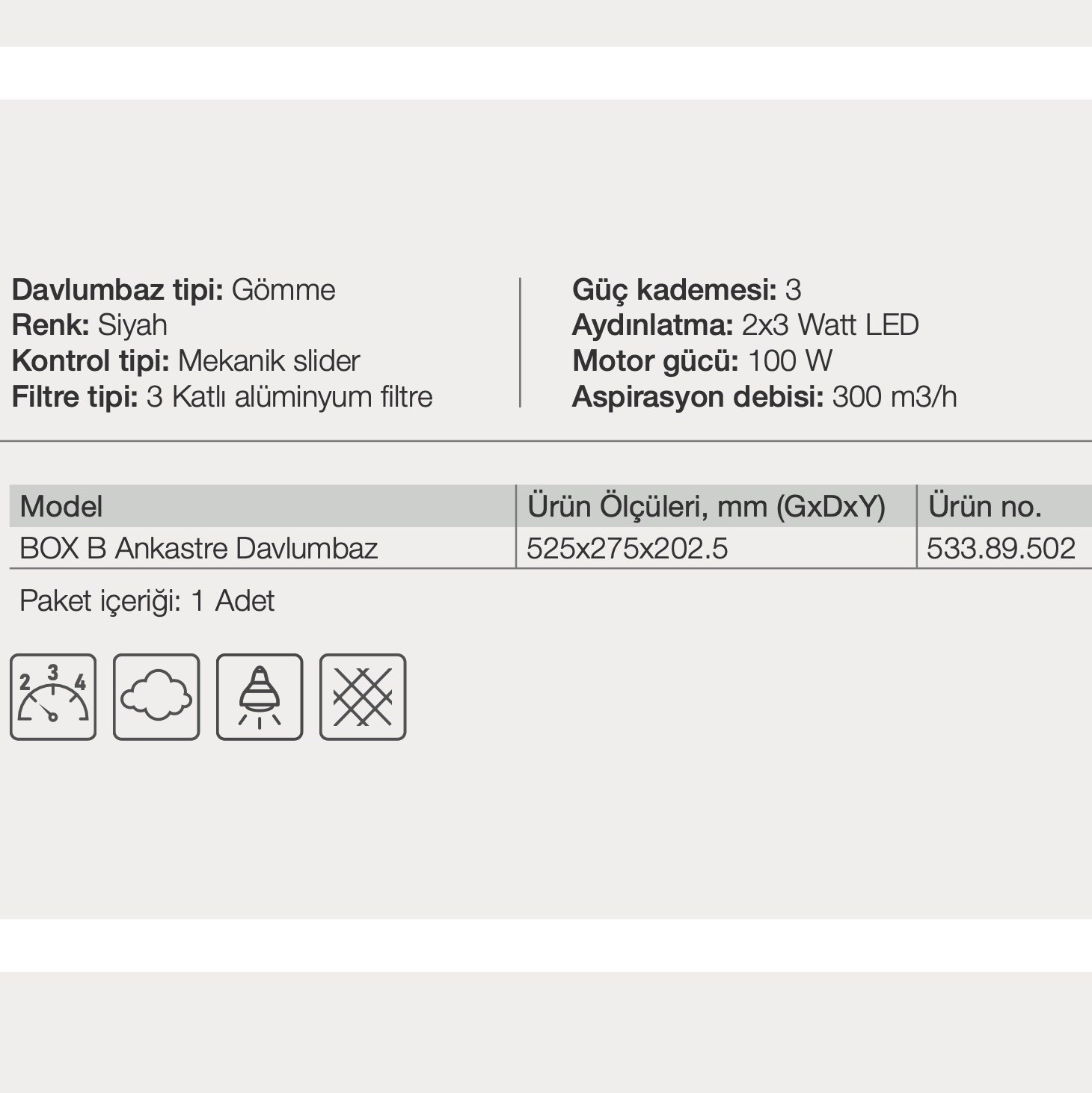 Davlumbaz tipi: Gömme. Renk: Siyah. Kontrol tipi: Mekanik slider ü. Filtre tipi: 3 Katlı alüminyum filtre. Güç kademesi: 3. Aydınlatma: 2x3 Watt LED . Motor gücü: 100 W . Aspirasyon debisi: 300 m3/h