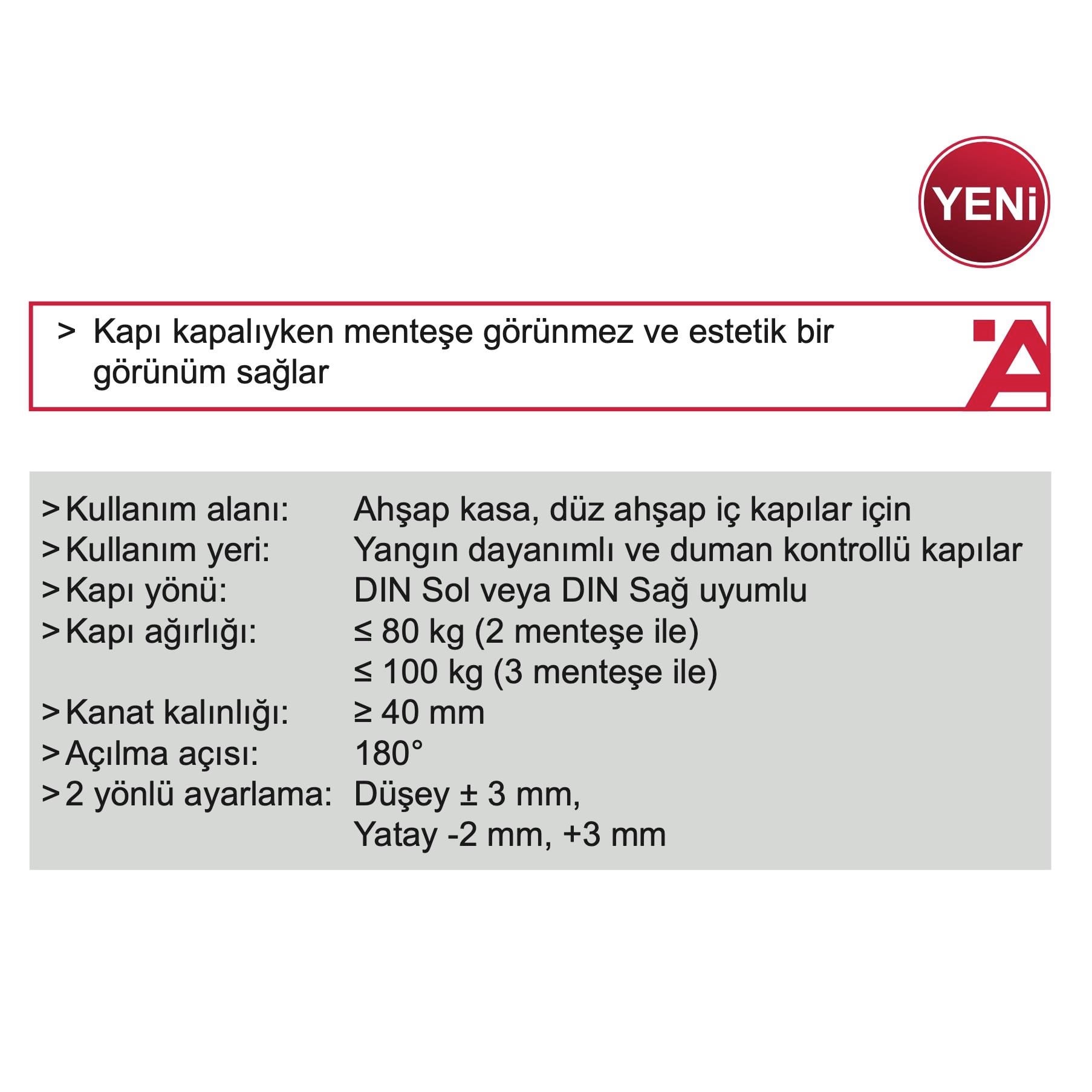 Taşıma kapasitesi ≤ 80 kg (2 menteşe ile) ≤ 100 kg (3 menteşe ile). Minimum Kapı Kalınlığı ≥ 40 mm. Açılma Açısı 180°. Ayar İmkanı Düşey ± 3 mm