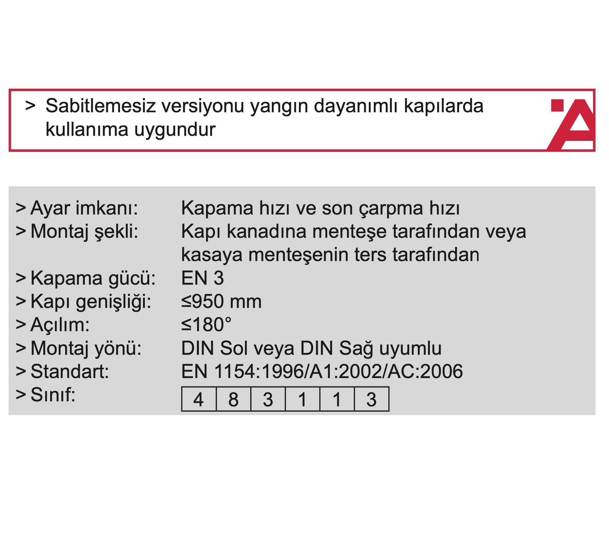 Hafele DCL 10 Dirsek Kollu Yangın Dayanımlı Kapı Kapatıcı. Ayar imkanı: Kapama hızı ve son Çarpma hızı. Montaj Şekli: Kapı kanadına menteşe tarafından veya kasaya menteşenin ters tarafından. Kapama gücü: EN 3. Kapı genişliği: Maximum 950 mm. Açılım Derecesi: 180 derece. Montaj Yönü: DIN Sol veya DIN Sağ uyumlu. Standart: EN 1154:1996/A1:2002/AC:2006. Sınıf: 4 8 3 1 1 3 931.77.039