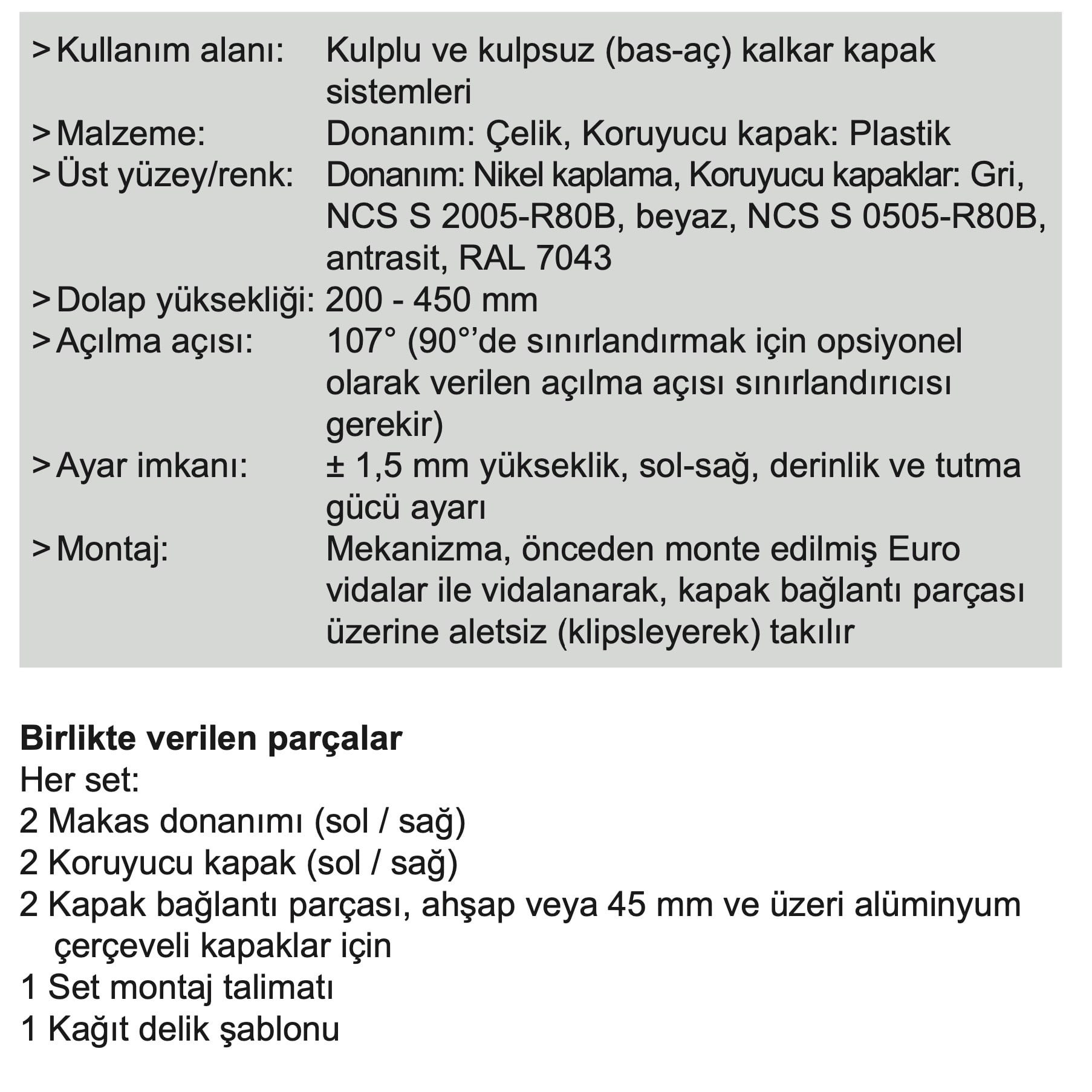 107° (90°’de sınırlandırmak için opsiyonel olarak verilen açılma açısı sınırlandırıcısı gerekir). ± 1,5 mm yükseklik