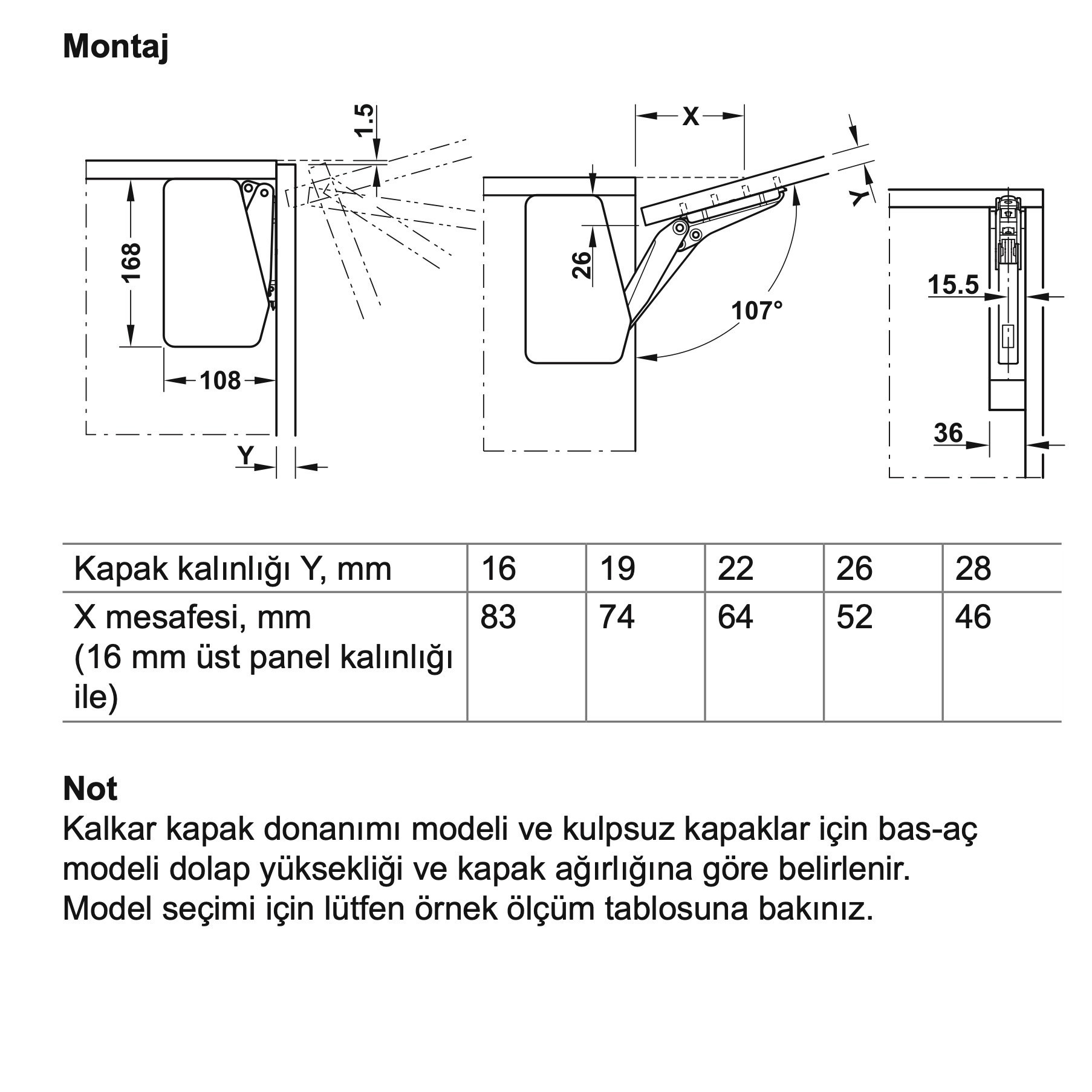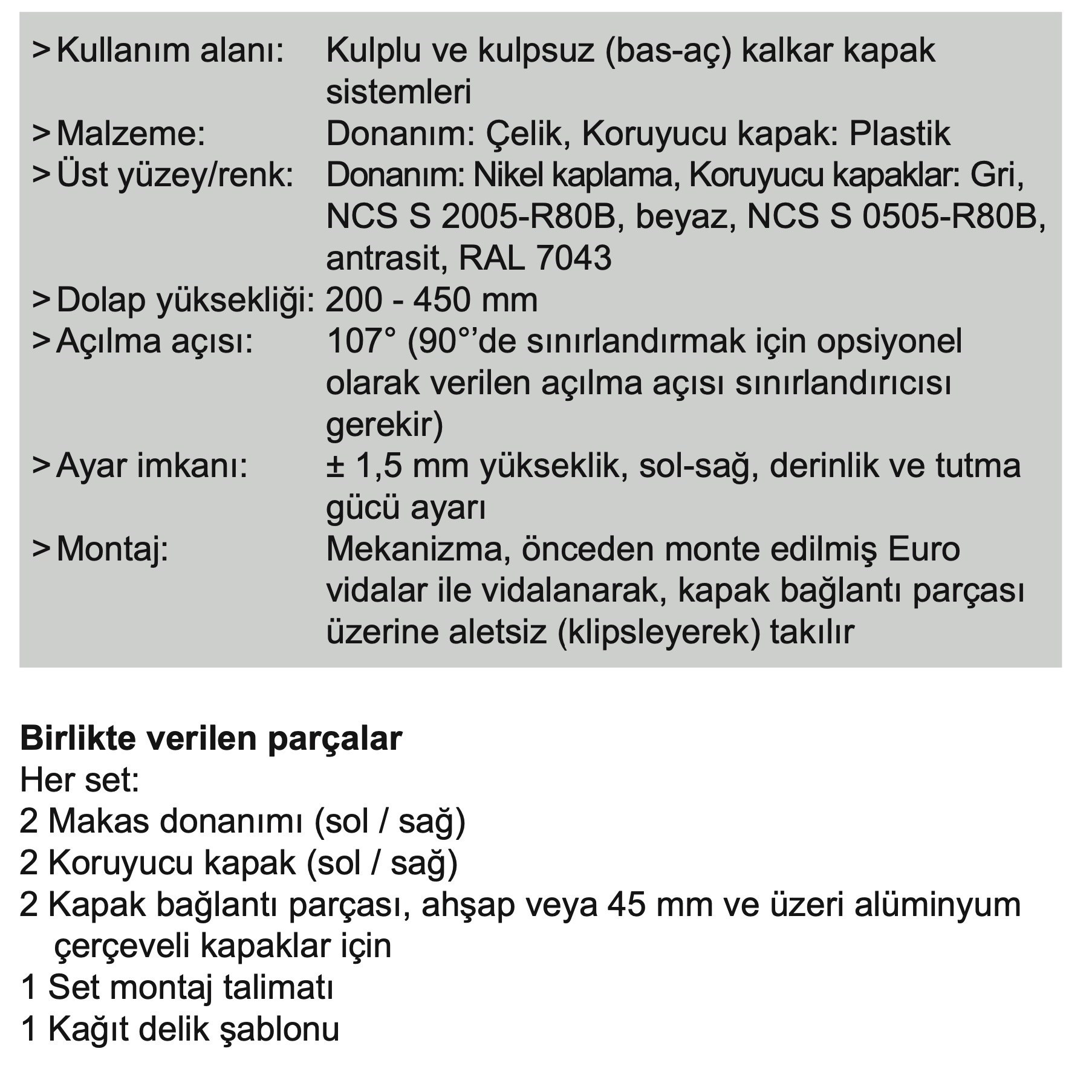 107° (90°’de sınırlandırmak için opsiyonel olarak verilen açılma açısı sınırlandırıcısı gerekir). ± 1,5 mm yükseklik