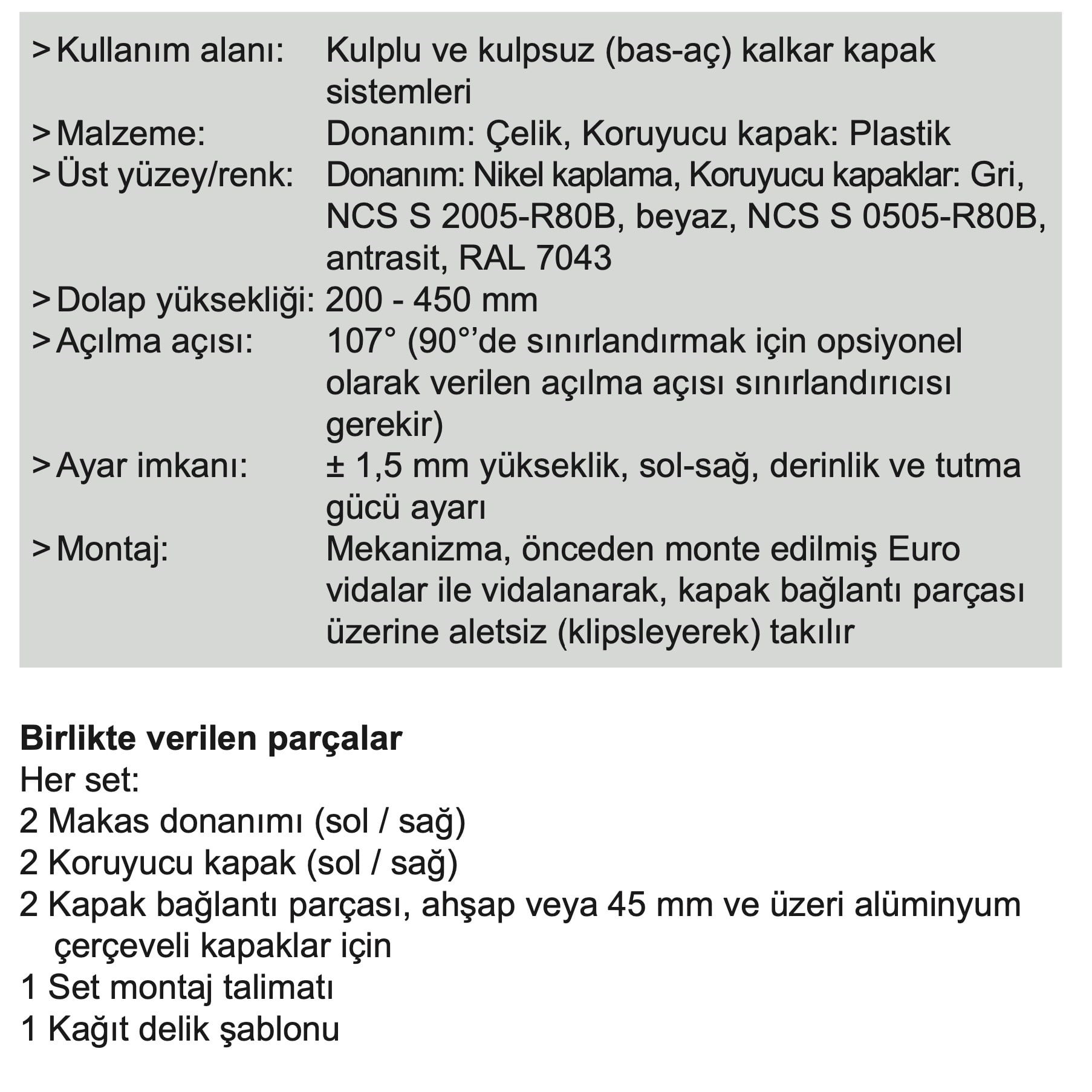 Hafele Free 1.7 Makas Seti - Beyaz Model A. Kulplu ve kulpsuz (bas-aç) kalkar kapak sistemidir