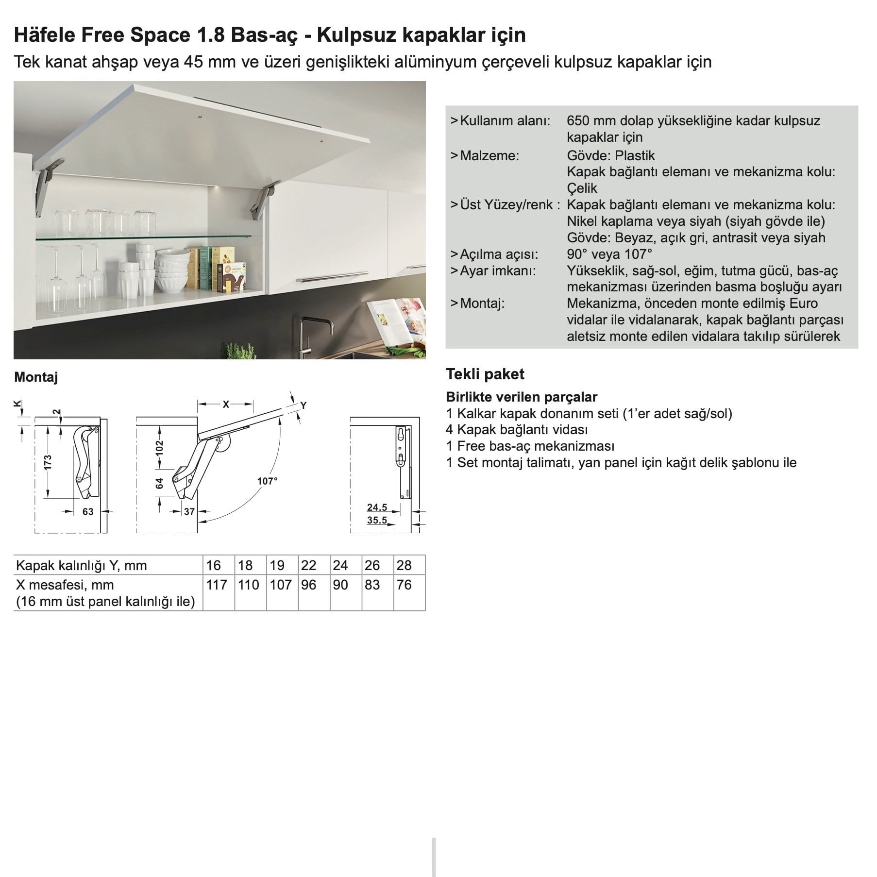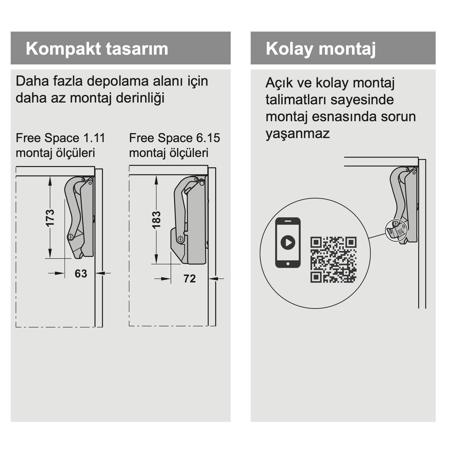 en çok tercih edilen kapak ölçüleri ve ağırlıklarını kapsar. Free Space 6.15/5.15 bas-aç model serisi ise daha geniş ve ağır kapaklar için uygundur. Son derece kompakt: Mobilyalarda minimal görünüm ve daha fazla depolama alanı. Kapakları açarken rahat çalışma. Hızlı ve zaman kazandıran montaj imkanı. Dört farklı renk seçeneği. Bas-aç modeli ile kulpsuz kapaklarda kullanım