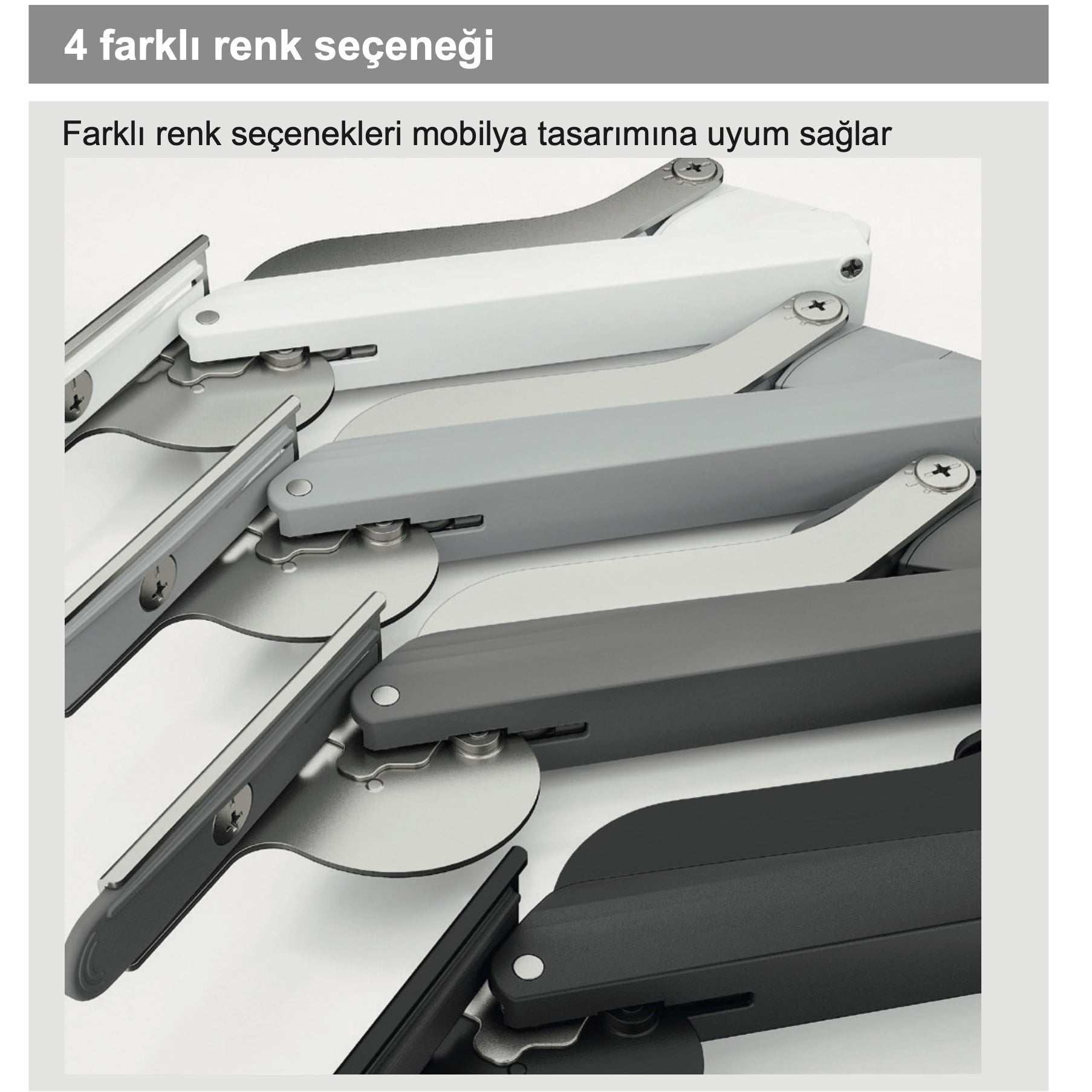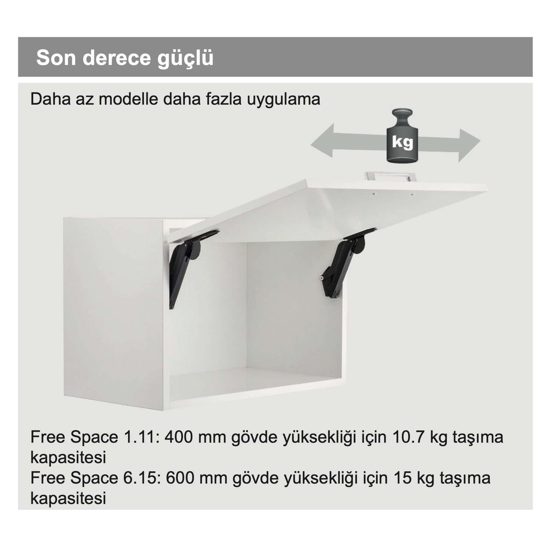 en çok tercih edilen kapak ölçüleri ve ağırlıklarını kapsar. Free Space 6.15/5.15 bas-aç model serisi ise daha geniş ve ağır kapaklar için uygundur. Son derece kompakt: Mobilyalarda minimal görünüm ve daha fazla depolama alanı. Kapakları açarken rahat çalışma. Hızlı ve zaman kazandıran montaj imkanı. Dört farklı renk seçeneği. Bas-aç modeli ile kulpsuz kapaklarda kullanım