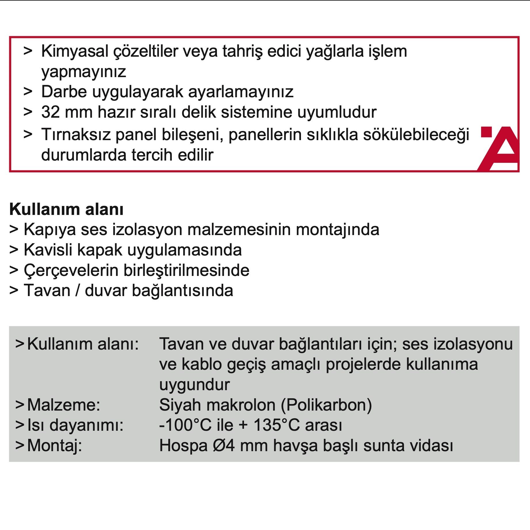 Malzeme Siyah makrolon Polikarbon -100°C ile + 135°C arası ısı dayanımlıdır