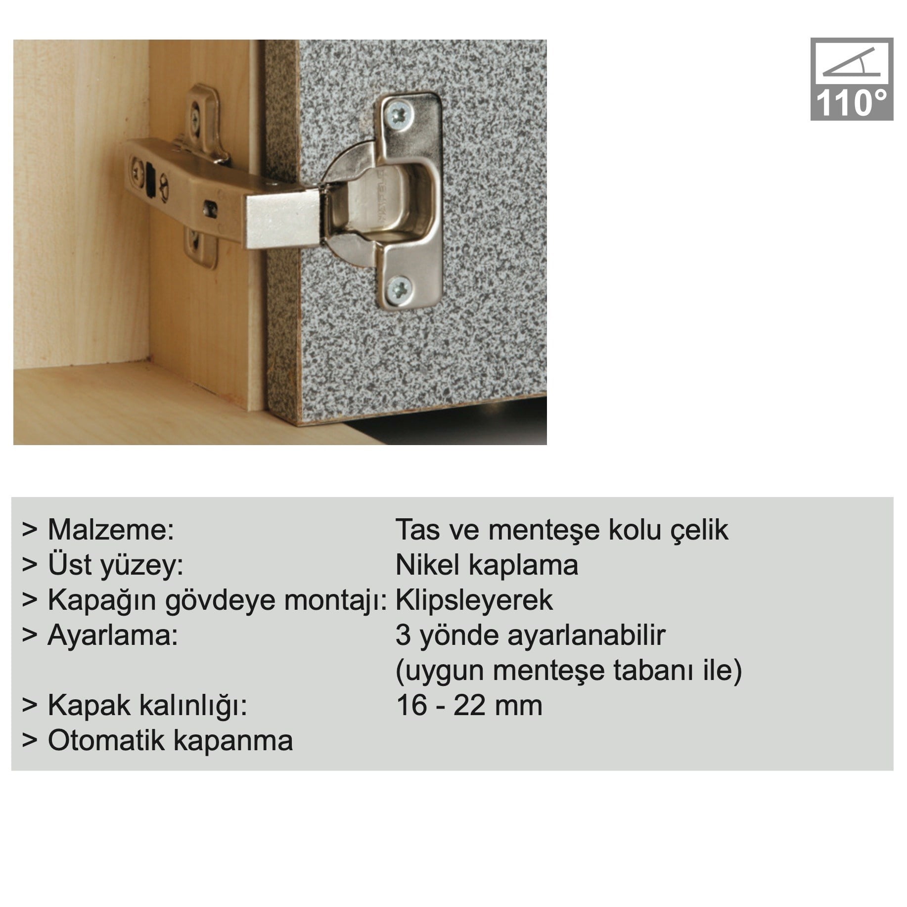 Ayarlama: 3 yönde ayarlanabilir (uygun menteşe tabanı ile)