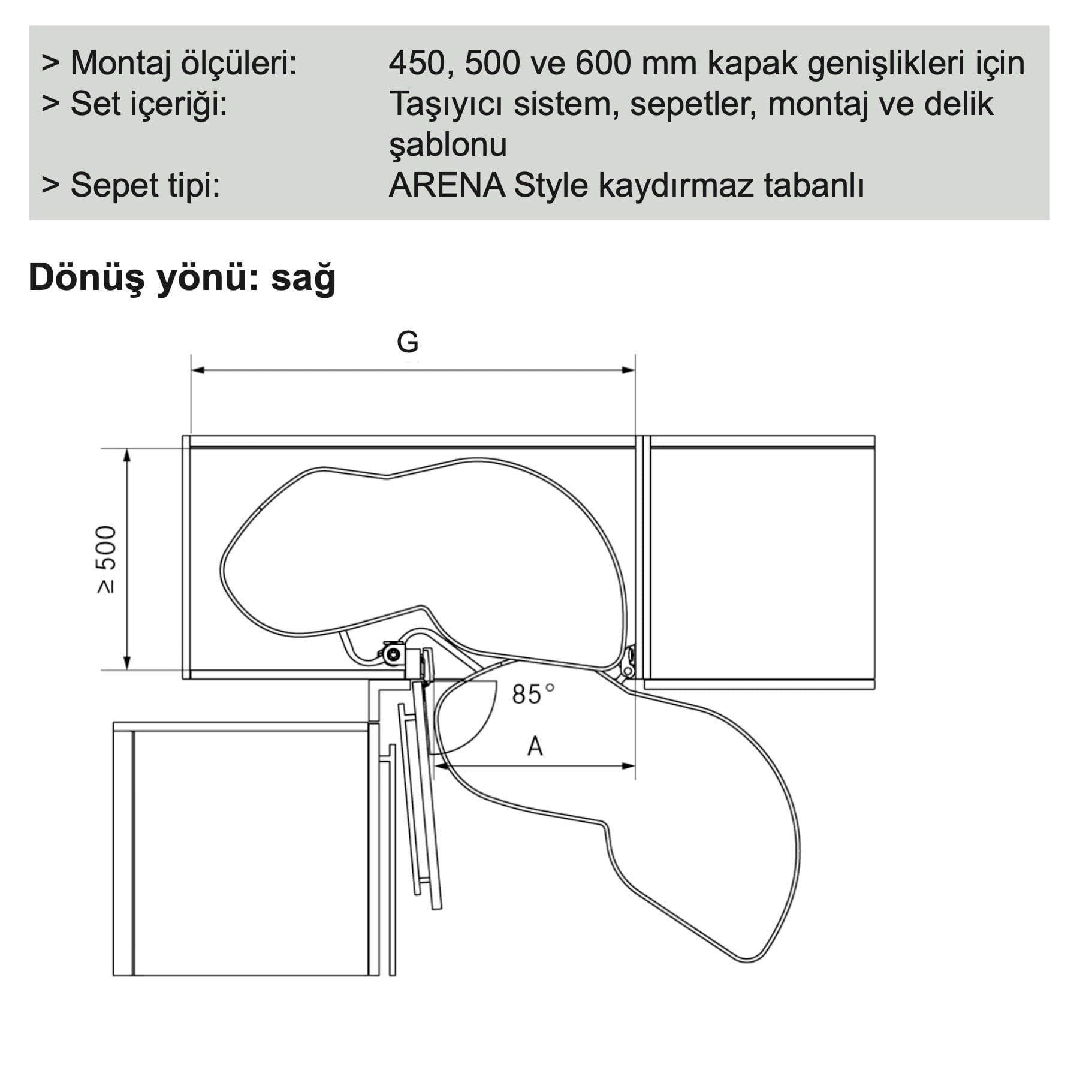 dolap kapağı minimum 85° açıkken dışarı çıkabilir. Her bir sepet için taşıma kapasitesi: Maksimum 25 kg. Sepetlere opsiyonel olarak takılan SoftSTOPPplus yavaşlatıcı piston ile yavaş kapanma özelliğine sahiptir