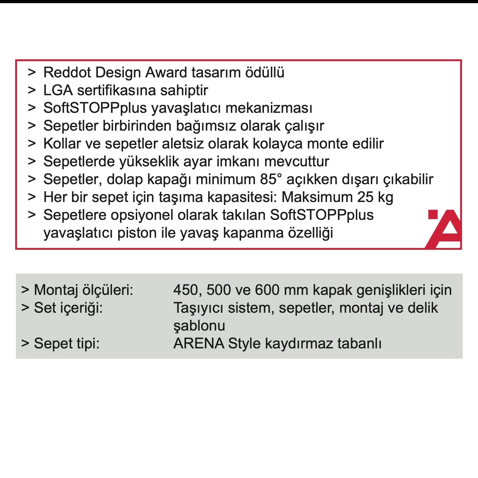 Reddot Design Award tasarım ödüllü. ARENA Style kaydırmaz tabanlı. LGA sertifikasına sahiptir. SoftSTOPPplus yavaşlatıcı mekanizması. Sepetler birbirinden bağımsız olarak çalışır. Kollar ve sepetler aletsiz olarak kolayca monte edilir. Sepetlerde yükseklik ayar imkanı mevcuttur. Sepetler