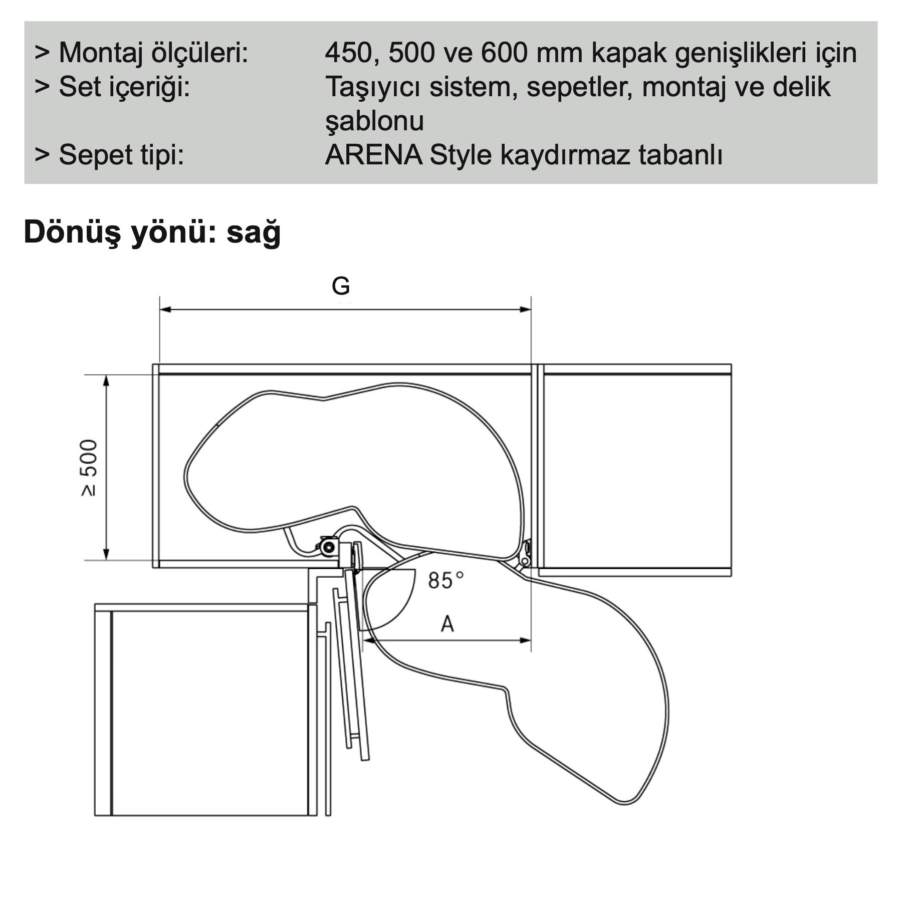 dolap kapağı minimum 85° açıkken dışarı çıkabilir. Her bir sepet için taşıma kapasitesi: Maksimum 25 kg. Sepetlere opsiyonel olarak takılan SoftSTOPPplus yavaşlatıcı piston ile yavaş kapanma özelliğine sahiptir