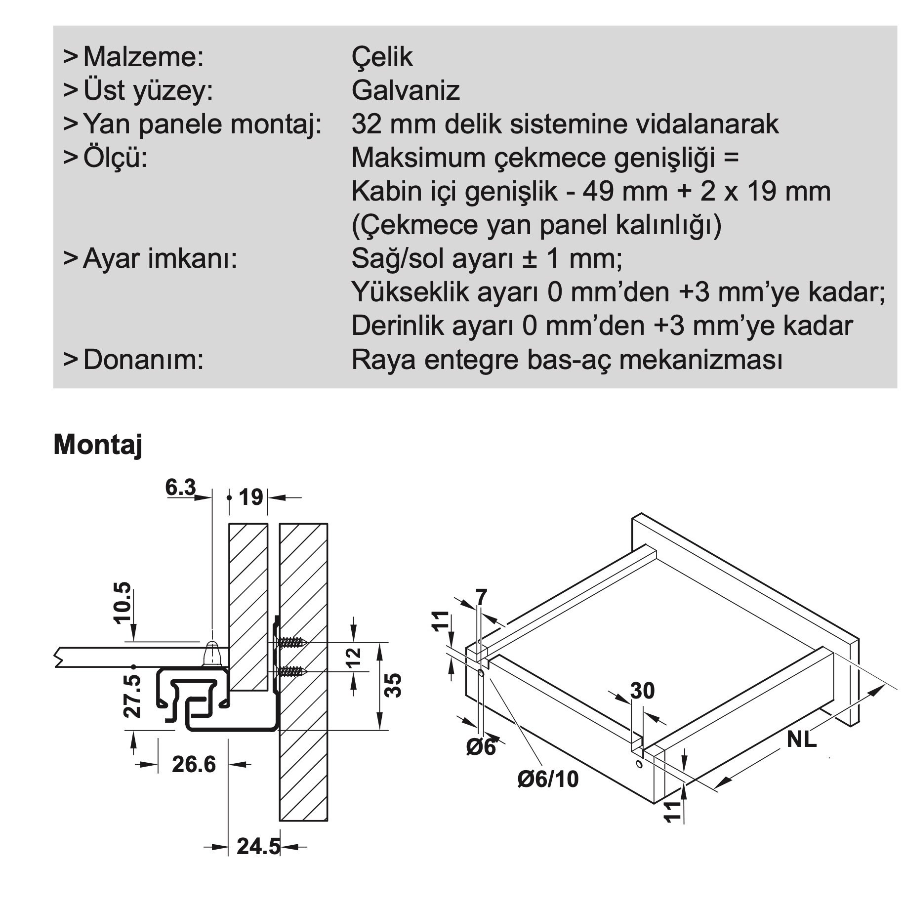 32 mm delik sistemine vidalanarak Maksimum çekmece genişliği =Kabin içi genişlik - 49 mm + 2 x 19 mm (Çekmece yan panel kalınlığı). Sağ/sol ayarı ± 1 mm;. Yükseklik ayarı 0 mm’den +3 mm’ye kadar; Derinlik ayarı 0 mm’den +3 mm’ye kadar