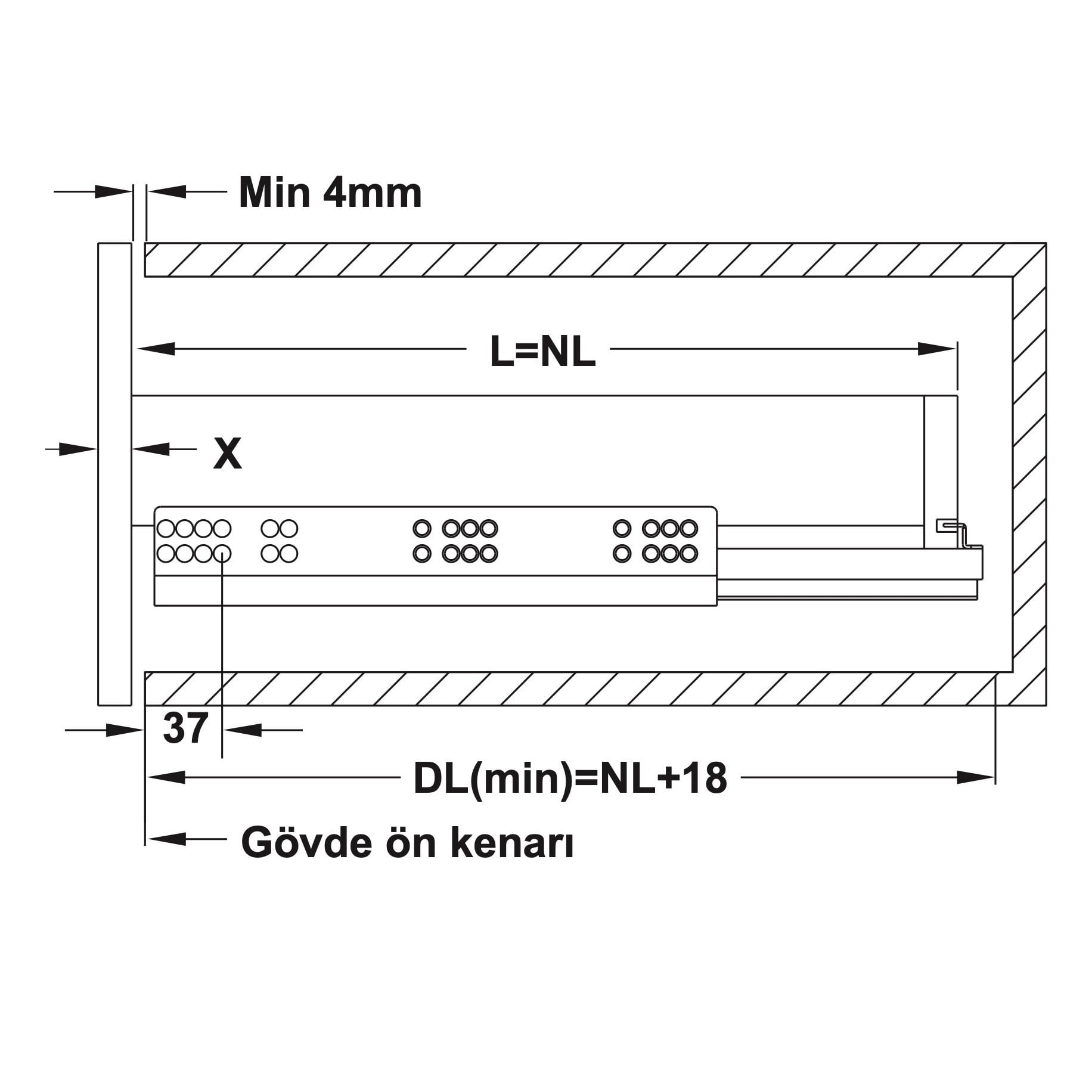 32 mm delik sistemine vidalanarak Maksimum çekmece genişliği =Kabin içi genişlik - 49 mm + 2 x 19 mm (Çekmece yan panel kalınlığı). Sağ/sol ayarı ± 1 mm;. Yükseklik ayarı 0 mm’den +3 mm’ye kadar; Derinlik ayarı 0 mm’den +3 mm’ye kadar