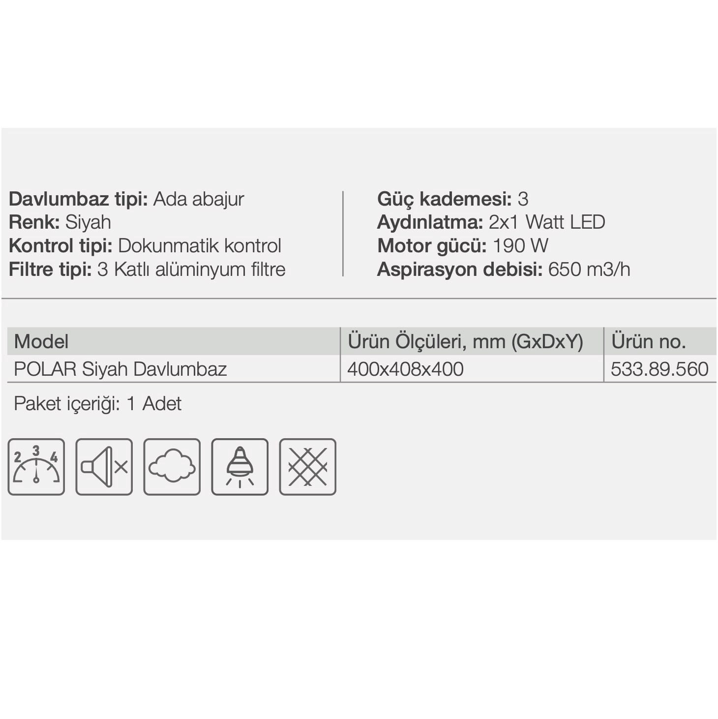 Davlumbaz tipi: Ada. Renk: Beyaz. Kontrol tipi: Dokunmatik kontrol . Filtre tipi: 3 Katlı alüminyum filtre. Güç kademesi: 3 . Aydınlatma: 2x1 Watt LED . Motor gücü: 190 W . Aspirasyon debisi: 650 m3/h