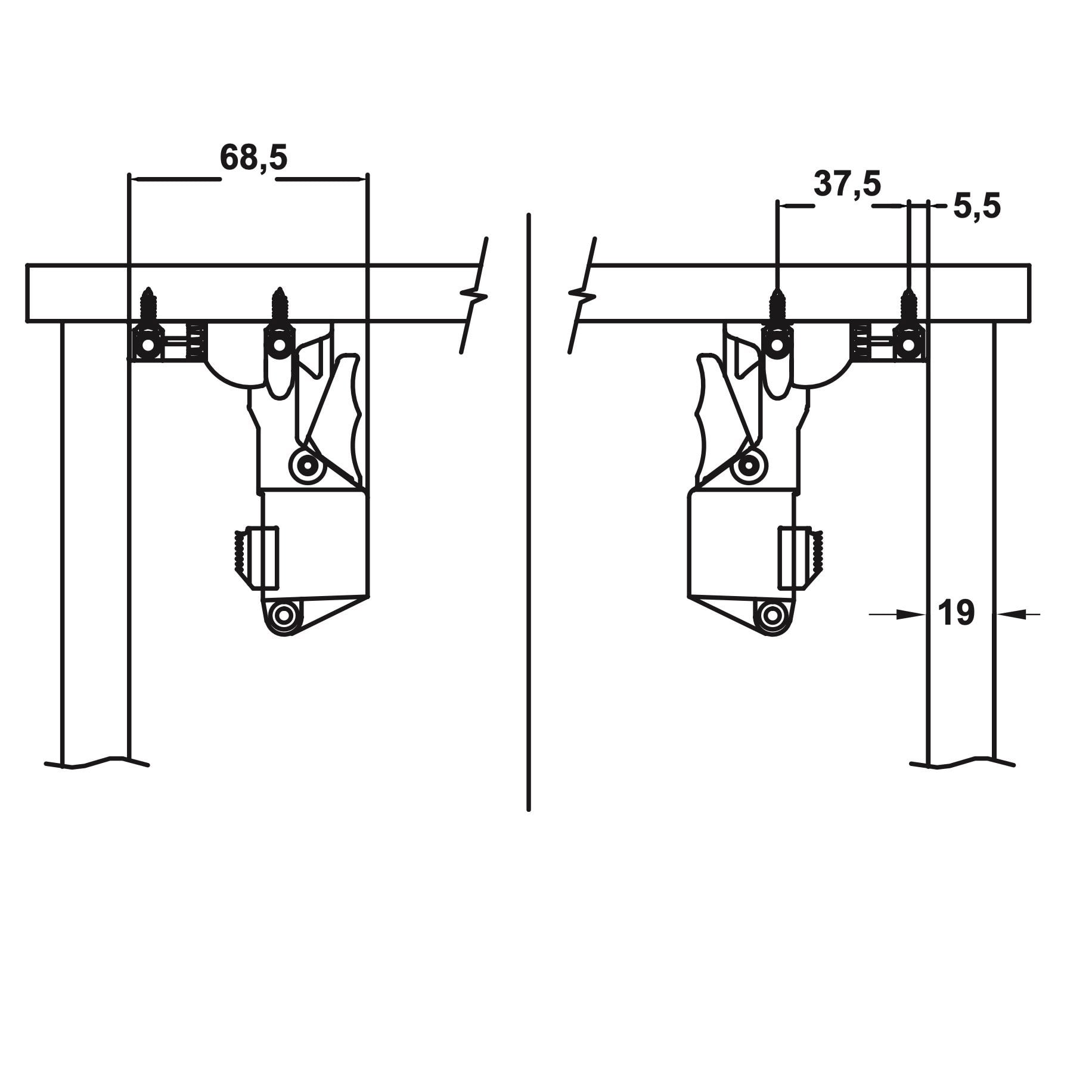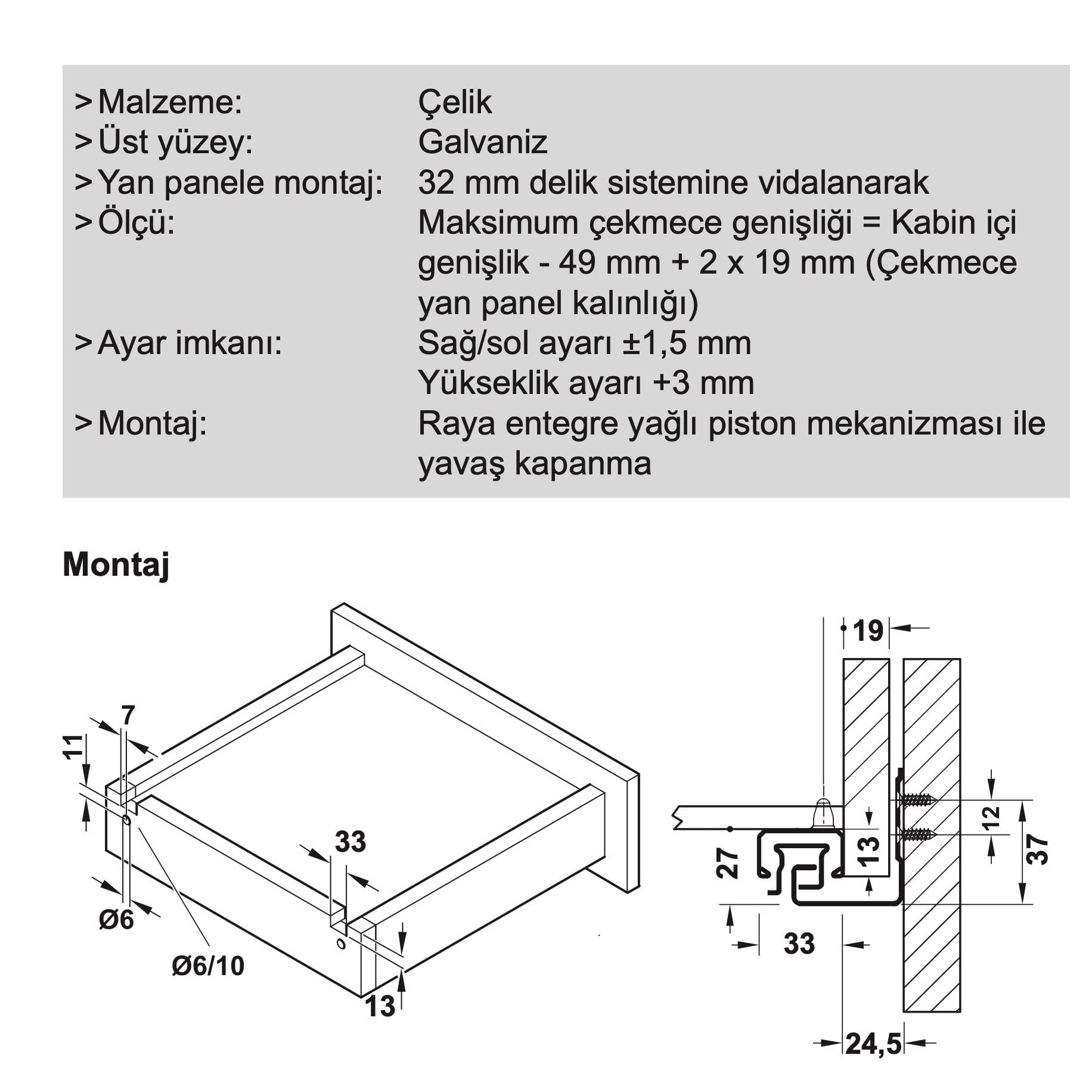 32 mm delik sistemine vidalanarak Maksimum çekmece genişliği = Kabin içi genişlik - 49 mm + 2 x 19 mm (Çekmece yan panel kalınlığı)