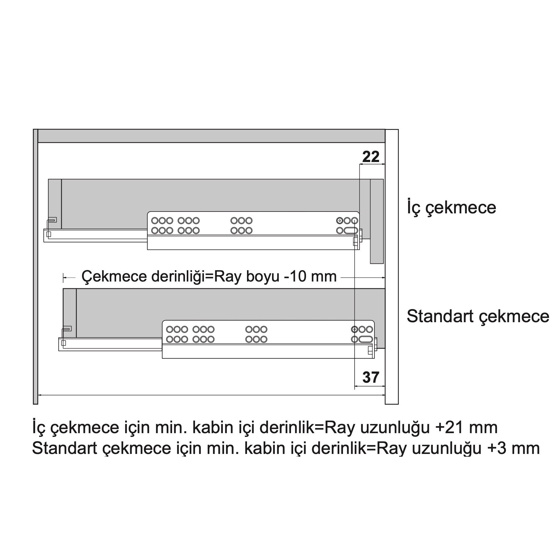 32 mm delik sistemine vidalanarak Maksimum çekmece genişliği = Kabin içi genişlik - 49 mm + 2 x 19 mm (Çekmece yan panel kalınlığı)