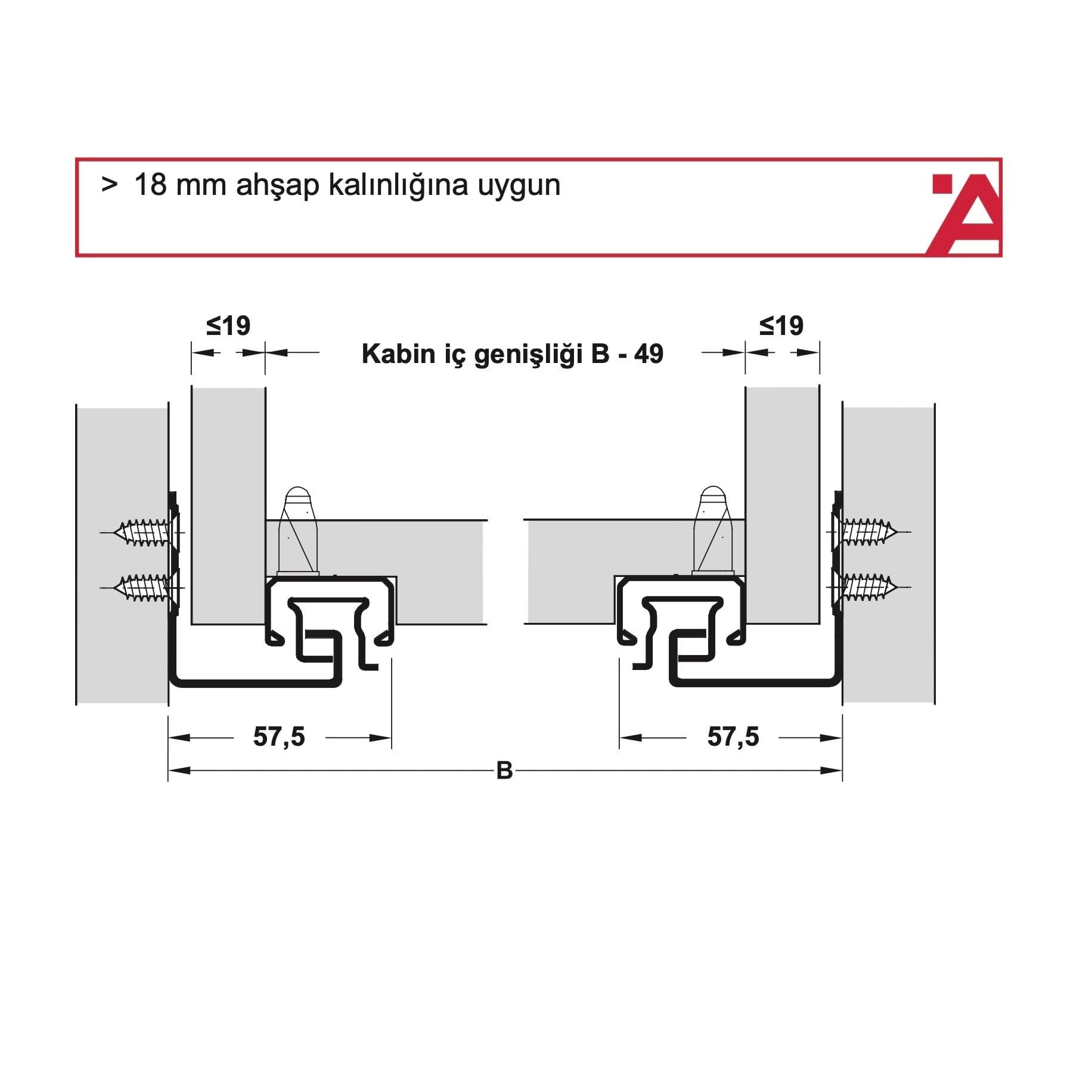 32 mm delik sistemine vidalanarak Maksimum çekmece genişliği = Kabin içi genişlik - 49 mm + 2 x 19 mm (Çekmece yan panel kalınlığı)