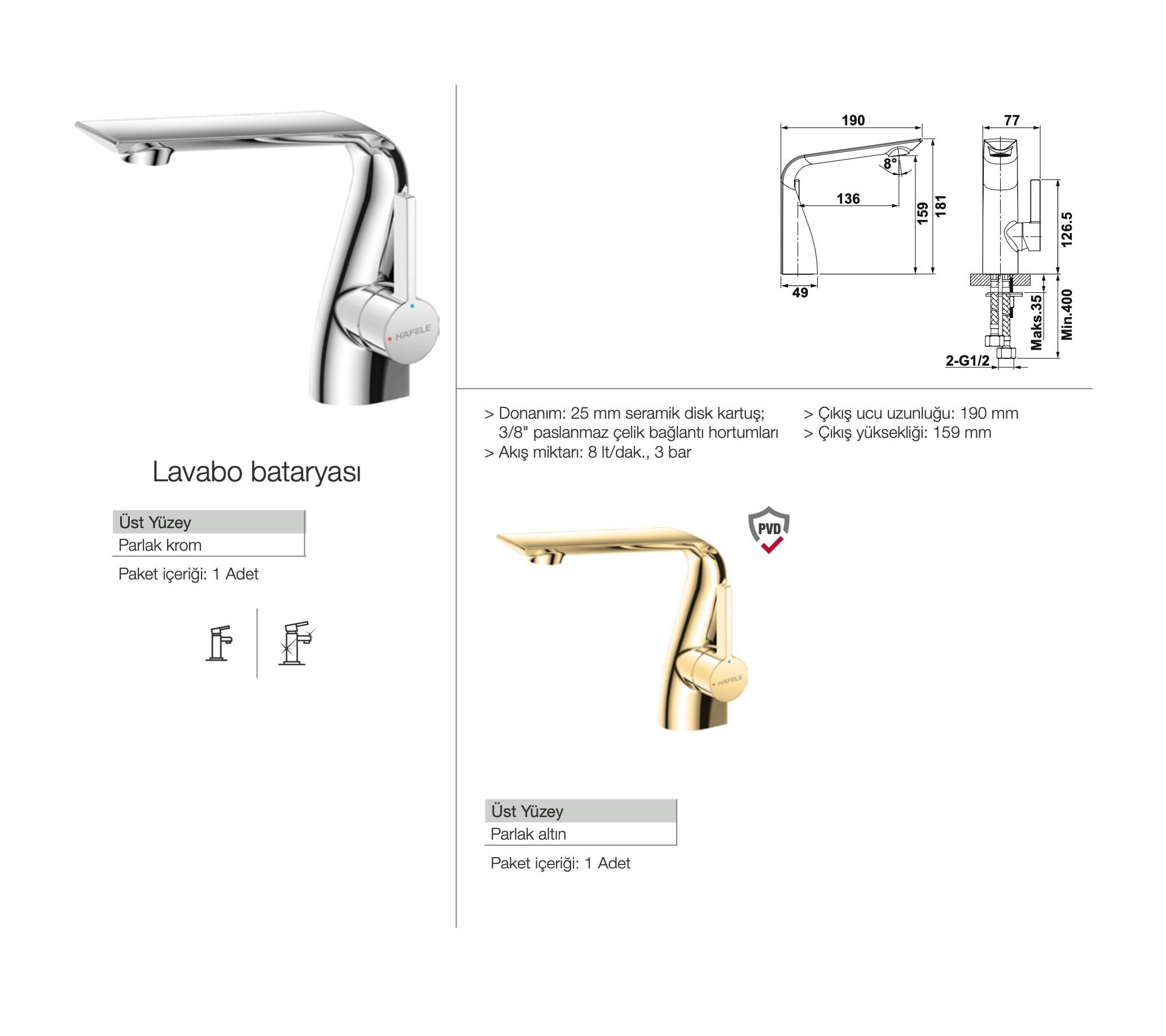 enerji tasarrufu sağlar. Parmak izi bırakmayan anti-fingerprint PVD kaplama teknolojisi ile üstün yüzey kalitesi. Donanım: 25 mm seramik disk kartuş;. 3/8" paslanmaz çelik bağlantı hortumları ile sevk edilir